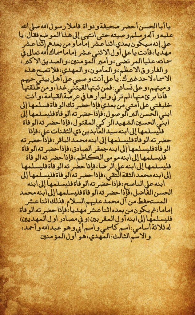 De un grupo, de Abu Abdulá Al-Husein Bin Alí Bin Sufián Al-Bazufari, de Alí Bin Sinan Al-Musili Al-Adl, de Alí Bin Al-Husein, de Ahmed Bin Muhammad Bin Al-Jalil, de Yafar Bin Ahmed Al-Misri, de Al-Husein Bin Alí Al-Misri (tío materno de Yafar), de Alí Bin Bayán Bin Zaid Bin Sayaba (Abul Husein), de Abu Abdulá Yáfar hijo de Muhammad, de su padre Al-Báqir, de su padre “Di Az-Zafanat (El de la callosidad)”, “Sayed Al-Abidín (Señor de los adoradores)”, de su padre Husein “Az-Zaki (El Puro)”, “Ash-Shahid (El Mártir)”, de su padre el Comandante de los Creyentes –con ellos sea la paz–, que dijo: El Mensajero de Dios –bendígale Dios y a su familia y les dé paz–en la noche que fue su partida, dijo a Alí –con él sea la paz–: «Oh, Abul Hasan (Padre de Hasan), presenta una pergamino y un tintero». Entonces el Mensajero de Dios –bendígale Dios y a su familia y les de paz– le dictó su testamento hasta acabar en este lugar, así pues, dijo: «Oh, Alí, habrá después de mí doce Imames y después de ellos, doce Mahdis. Y tú, Alí, eres el primero de los doce Imames. Dios Enaltecido en Su cielo te ha llamado “Alí Al-Murtada (El Complacido), Amir Al-Muminín (Comandante de los Creyentes), Siddiq Al-Ákbar (El Probo Mayor), Faruq Al-Aadam (El Gran Discernidor), Al-Mamún (El Fiable) y el Mahdi (El Guía). Y estos nombres no se atribuyen más que a ti, oh, Alí. Tú eres mi Albacea para la Gente de mi Casa, vivan o hayan muerto, y para mis mujeres, pues a quien de ellas constates me encontrará mañana, y a quien de ellas repudies, pues me desentenderé de ella. No me verá y yo no la veré en la explanada de la Resurrección. Y tú eres mi Sucesión para mi nación después de mí. Así pues, cuando se te presente la partida, entrégala a mi hijo Hasan, “Al-Birr Al-Wusul (El Virtuoso del Logro)”. Y cuando se le presente la partida, que la entregue a mi hijo Husein “Ash-Shahid (El Mártir)”, “Az-Zaki (El Puro)”, “Al-Maqtul (El Matado)”. Y cuando se le presente la partida que la entregue a su hijo, “Sayed Al-Abidín (Señor de los adoradores)”, “Di Az-Zafanat (El de la callosidad)”, Alí. Y cuando se le presente la partida, que la entregue a su hijo Muhammad “Al-Báqir (El Indagador). Y cuando se le presente la muerte, que la entregue a su hijo Yáfar “As-Sádiq (El Veraz)”. Y cuando se le presente la partida, que la entregue a su hijo Musa “Al-Kádim (El que se contiene)”. Y cuando se le presente la partida, que la entregue a su hijo Alí “Ar-Reda (El Complaciente)”. Y cuando se le presente la partida, que la entregue a su hijo Muhammad “Az-Zaqqa (El Fidedigno)”, “At-Taqi (El Pío)”. Y cuando se le presente la partida, que la entregue a su hijo Alí “An-Násih (El Consejero)”. Y cuando se le presente la partida, que la entregue a su hijo Hasan “Al-Fádil (El Excelente). Y cuando se le presente partida, que la entregue a su hijo Muhammad “Al-Mustahfad (El Reservista)” de la familia de Muhammad –con ellos sea la paz. Así pues, estos son los doce Imames. Luego, habrá después de ellos doce Mahdis. Así que cuando se le presente la partida, que la entregue a su hijo, el primero de los cercanos. Tiene tres nombres: un nombre como mi nombre y el nombre de mi padre que es Abdulá, Ahmed y el tercer nombre es el Mahdi. Y él es el primero de los creyentes».