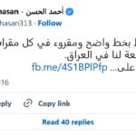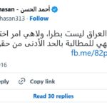 La paz sea con vosotros y la misericordia de Dios y Sus bendiciones #Iraq #Revolución Destrucción y sangre incesantes en Iraq. ¿No se debería pedir cuentas a los funcionarios a cargo de la seguridad interna de Iraq (Primer Ministro y Ministro del Interior) por sus incompetencias en el cumplimiento de sus deberes, tal como ellos… Lee más: La incompetencia de los funcionarios y el derramamiento de sangre continúan en Iraq